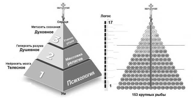 В итоге процесс соединения ума с сердцем с точки зрения психологии сетевых процессов выглядит как процесс строительства гиперсети духовного сознания от основания к вершине, где основание пирамиды – это нейросеть мозга (телесная сеть), а вершина пирамиды – это Христос и символ духовного сердца, как Метасети Духа (Бога).