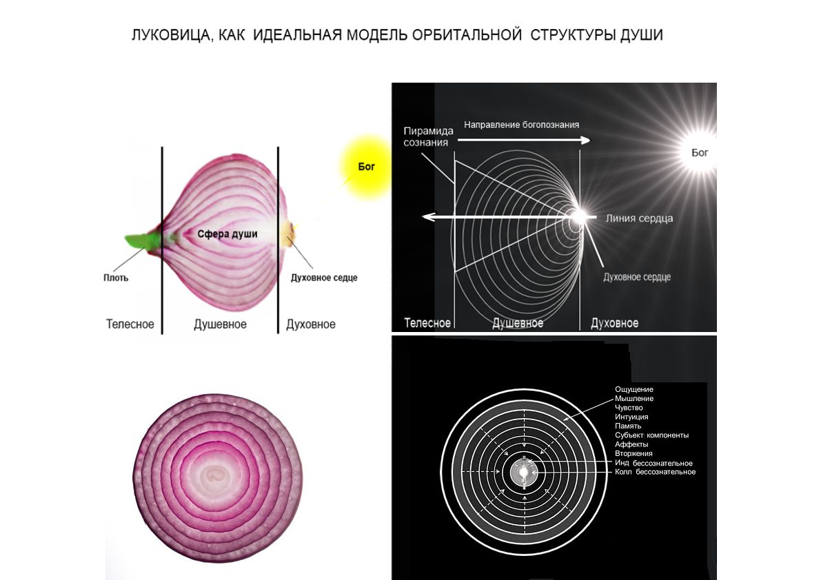 В данной связи луковица является идеальной моделью с помощью которой можно не только показать принцип тримерии человека и всего одушевлённого через призму уровней тело – душа – дух, но и показать принцип внутренних орбит души и психики через призму современной аналитической психологии: ощущение, мышление, чувство, интуиция, память, субъективные компоненты, вторжения, аффекты, индивидуальное бессознательное, коллективное бессознательное.